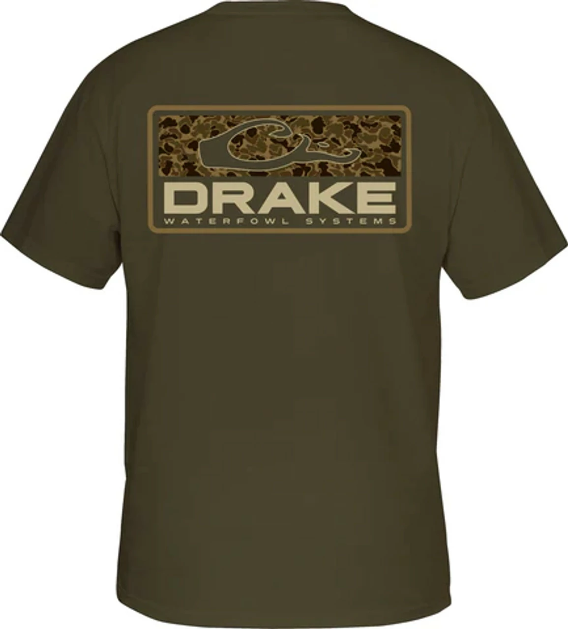 Premium 100% Ringspun cotton tee featuring a back screen print ofΒ our Old School camo pattern within a boxΒ with the Drake Logo printed beneath the camo pattern.Β Front left chest features simple classic DrakeΒ Waterfowl logo.