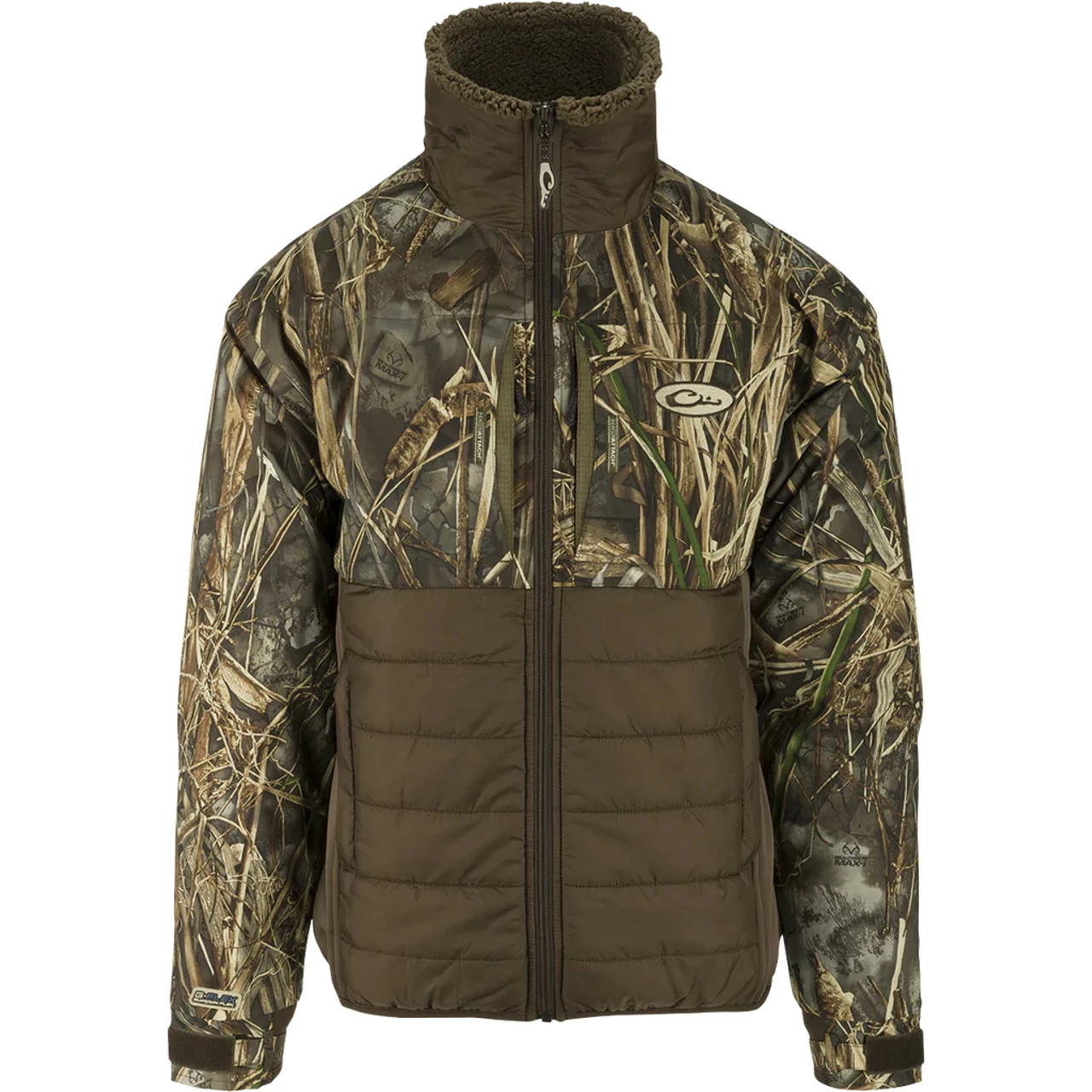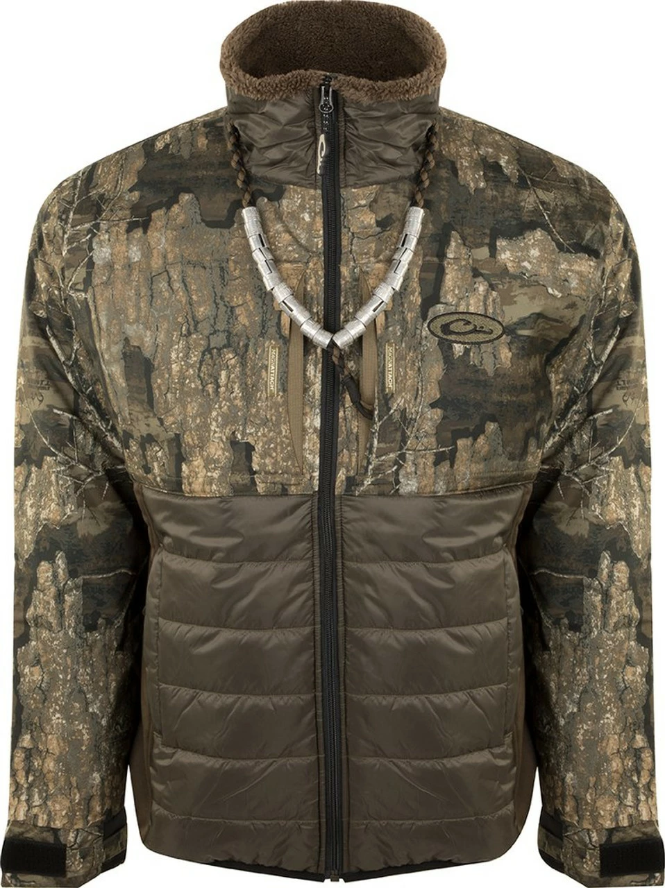 Our patented Eqwaderβ’ technology (patent #7,318,239) revolutionized waterfowl clothing and has been a core piece of the Drake Waterfowl brand since day one. Just like the Earth’s equator is the dividing line between two distinct temperate zones, we noticed a similar dividing line on the body when you are wearing chest waders: cold, hostile conditions above the waders, and warm, humid conditions underneath the waders. Our unique combination of waterproof/breathable fabric on the sleeves and upper body matched with ultra-breathable fleece on the lower body introduced a whole new level of comfort and performance when wearing chest waders. The moisture-wicking polyester Double Down fabric on the lower torso is 15 times more breathable than the upper waterproof Guardian Flexβ’ material and works to prevent the build-up of perspiration and moisture vapor. These dual zones of protection keep you dry both inside and outside your waders.