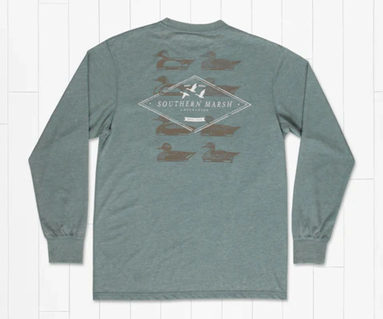 Make your mark this duck season in our long sleeve Decoy Stamp SEAWASHβ’ tee. Made with our specially treated fabric, itβs been heavy garment washed for softness and comfort. The material is meant to fade over time to make it look like it has been your favorite long sleeve tee, season after season. The breathable, lightweight fabric makes it airy and comfortable, and itβs finished with a front pocket featuring our Southern Marsh mallard silhouette logo.